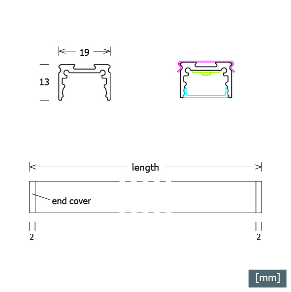 Special dimensions: length = profile length + (2 x 2 mm thickness of end covers)