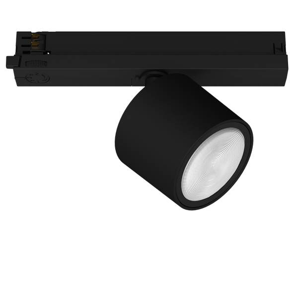 flexible track-mounted spotlight with slightly conical light-head, light-head rotates through 355° and pivots through 90° via integrated articulated arm, outstanding ease of maintenance, no UV and thermal emissions, anti-glare shield and decorative anti-glare ring available as accessories, light-head made from die-cast aluminium, innovative thermal management with design-integrated passive cooling, black internal thermoplastic front ring, high-quality Fresnel lens made of PMMA (Made in Germany) suitable for accentuation, 3-phase track adapter with integrated ballast