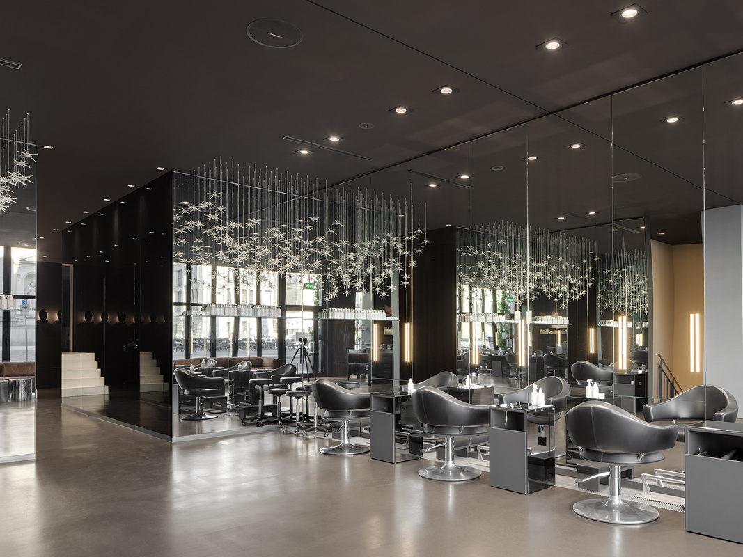 The German-Iranian businessman, Rahimkhan, took responsibility himself for the design of the new salon space. Overall, the lighting plays a significant role in the new store, because the architecture has been deliberately stripped back with clean lines and a minimalistic design language. The ceiling has been left black and lends the room a certain depth when combined with the anthracite-grey of the concrete floor.